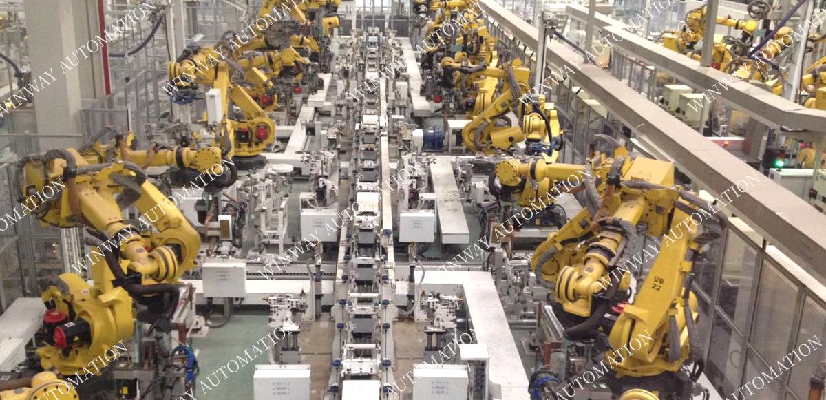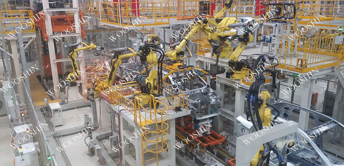 C51E主焊线,共9个工位30台机器人,总拼夹具采用“四面体”样式,输送采用SHUTTLE台车样式,设计最终节拍可达76S。